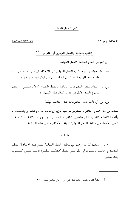 الاتفاقية رقم 29 لعام 1930 بشان السخرة أو العمل الجبري.