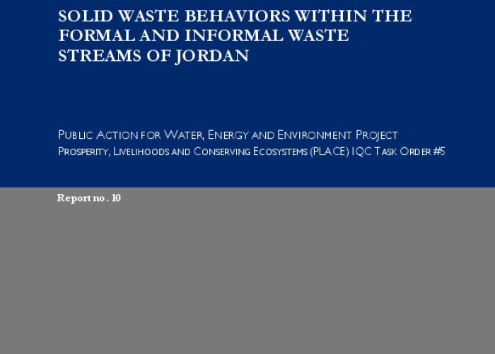 The report studies the formal and informal waste streams in Jordan as well as the public behaviors and attitudes that influence them. The study gives a specific emphasis to discovering the “drivers” of these practices as well as barriers to change and aims to locate examples of model behavior that already exists in Jordan so that they can be encouraged and duplicated. It investigates and assesses the four areas – the general attitudes of the Jordanian population towards waste and waste disposal,informal waste reclamation sector in Jordan,stream of recyclable material and the formal sanitation and waste management system of Amman and Aqaba. This research was conducted as part of the Public Action for Water,Energy and Environment Project (PAP),which aims to encourage water and energy conservation and to support behavior change towards more conservation and efficient practices both at the household level and in the commercial,industrial and civil society arenas using social marketing behavioral methods. The study finds that there were high levels of awareness and concern about issues such as littering and recycling but it also concludes that the lack of concern amongst the broader public was cited as one principal reasons that people were not taking action. It calls for a quantitative research to confirm Jordanian attitudes on environmental issues.